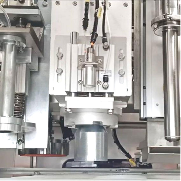 A vízálló burkolat manuálisan kerül a takarókészülékbe, automatikus szekvenciális betáplálás. A vízálló burkolat nyomókészüléke felszívja a vödör szájánál automatikusan elhelyezett vízálló fedelet, hogy megnyomja a fedelet.